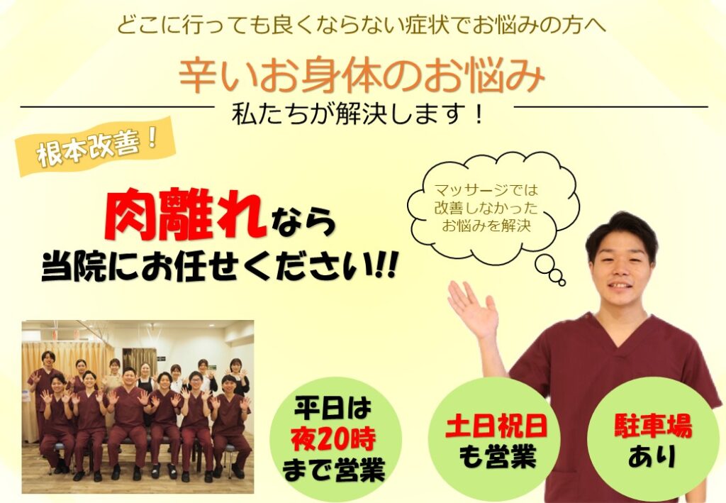 痛みがなかなか治らずにあきらめてしまっていた方、一人で悩まずにぜひ名古屋市東区・北区・瑞穂区めいほく接骨院にご相談下さい。